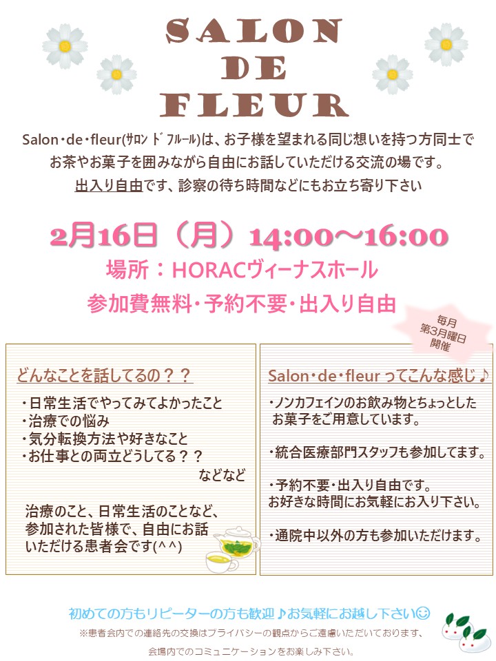 「salon de フルール」は、同じ想いを抱いている患者様同士やスタッフ達と自由にお話しいただける患者会です。お茶を囲みながらお話ししませんか?