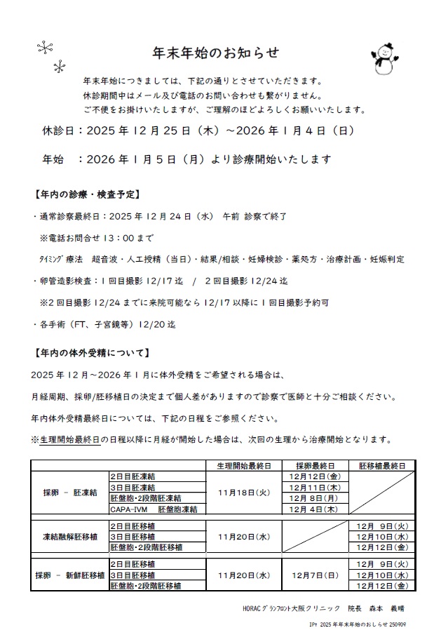それに伴い、体外受精についてはスケジュール内容により12月の採卵・移植の最終日が異なります。
