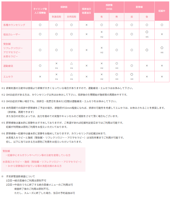 ★胚移植後は安全第一のため、お姫様生活を推奨しておりますが、ご希望があれば補助治療・カウンセリングを受けることは可能です。